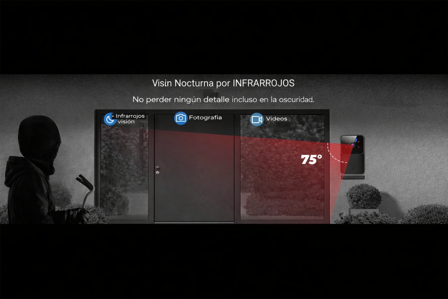 Su visiĂłn nocturna infrarroja automática te permite ver claramente incluso de noche o con poca luz. Tu entrada siempre protegida, de dĂa y de noche.